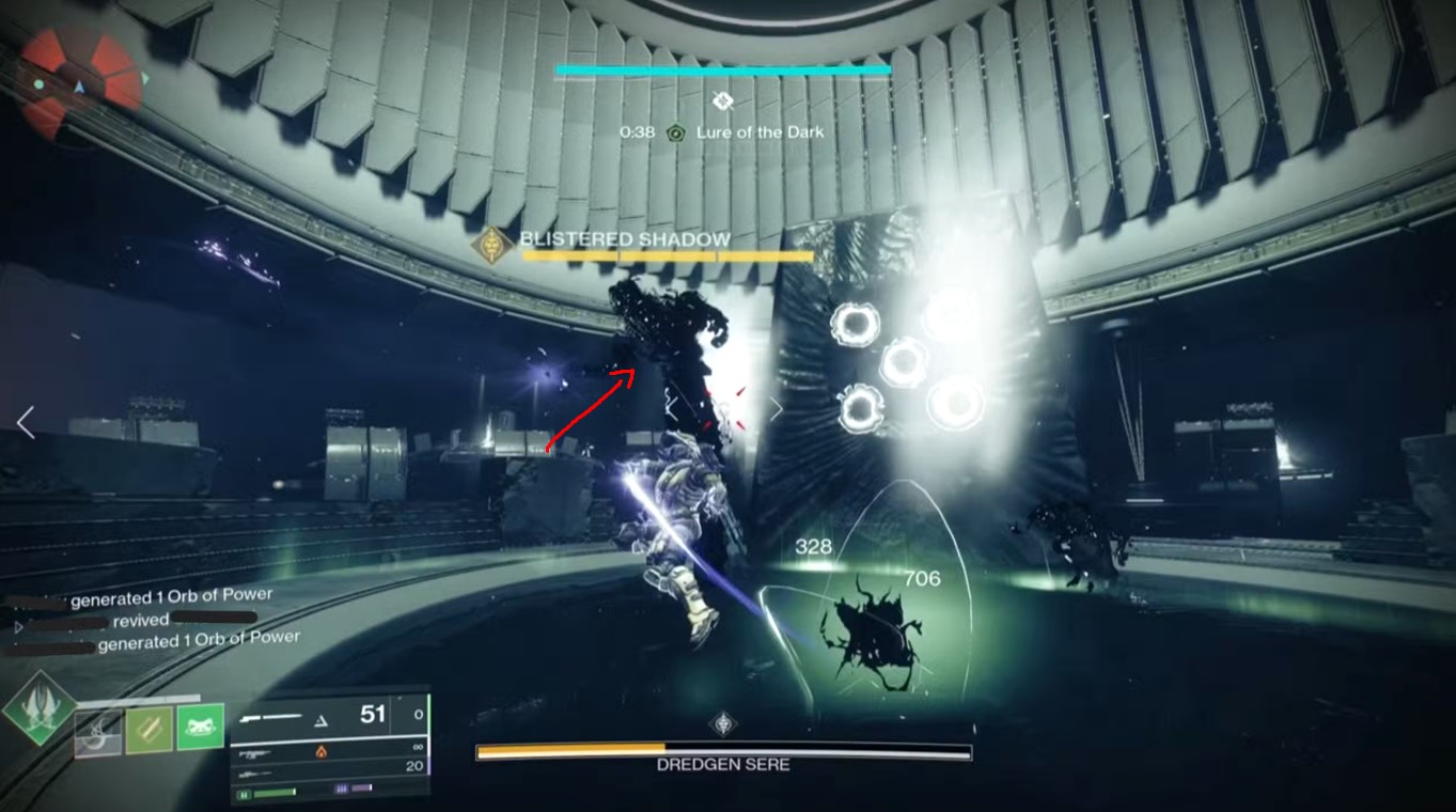When the Lure of the Dark timer reaches zero, you’ll be teleported into a Taken version of the arena. There are five shades of Sere in here named Blistered Shadows. There are Gathering Shadow pools all around in this space.